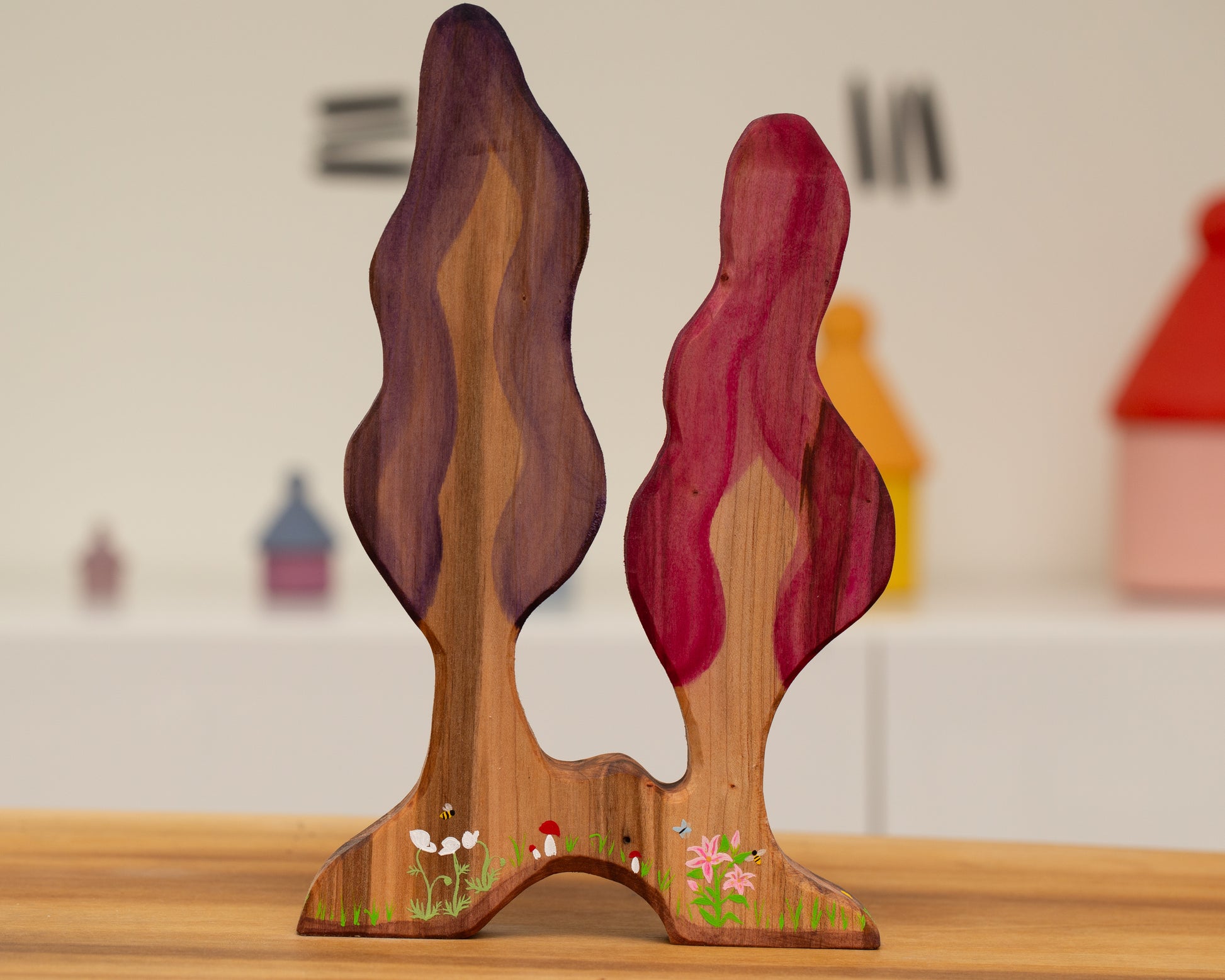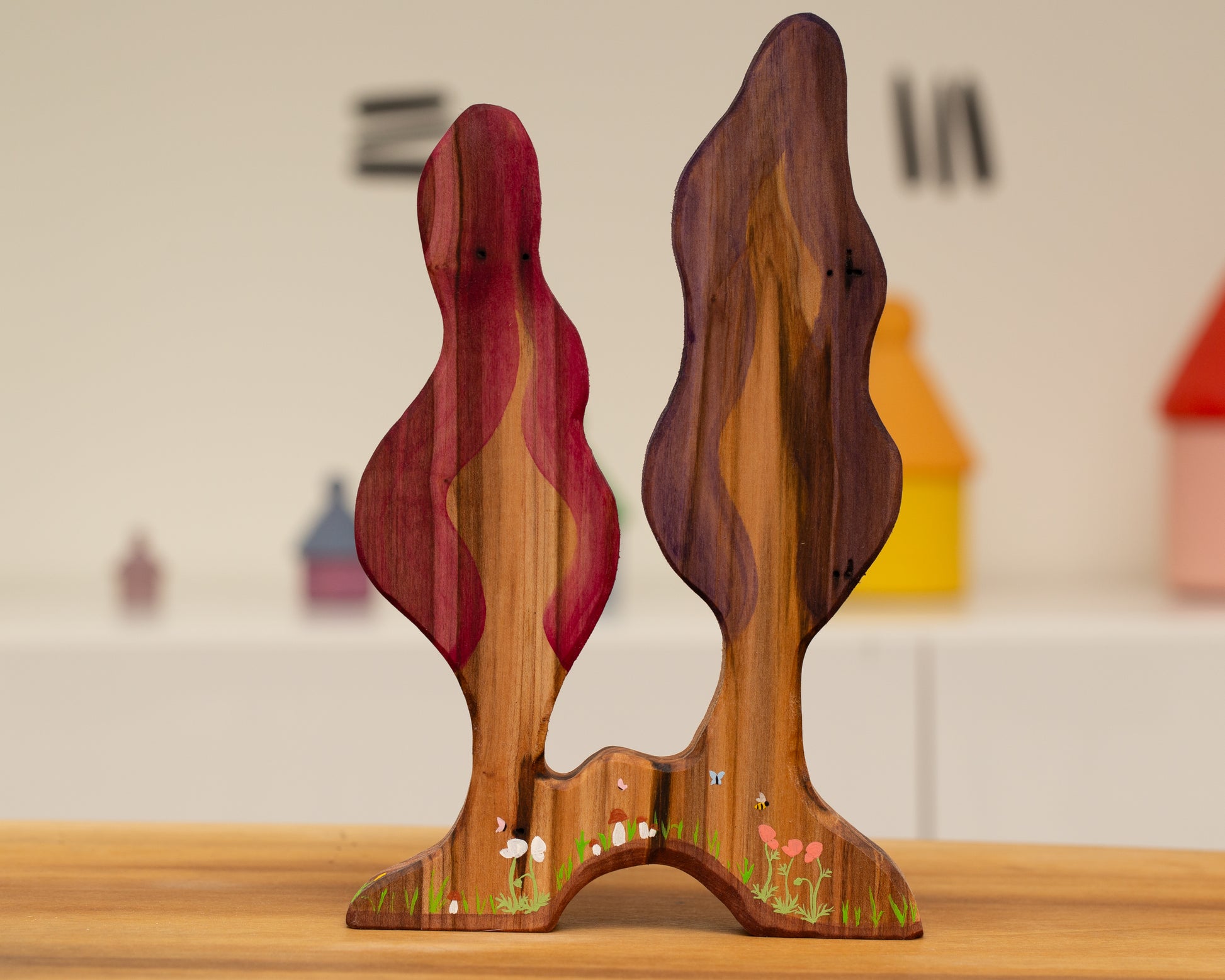 Double tree made from ambrosia maple with spectacular grain and little flowers, bees and butterflies details. Painted with watercolors acrylic details and finished with linseed oil and beeswax blend.