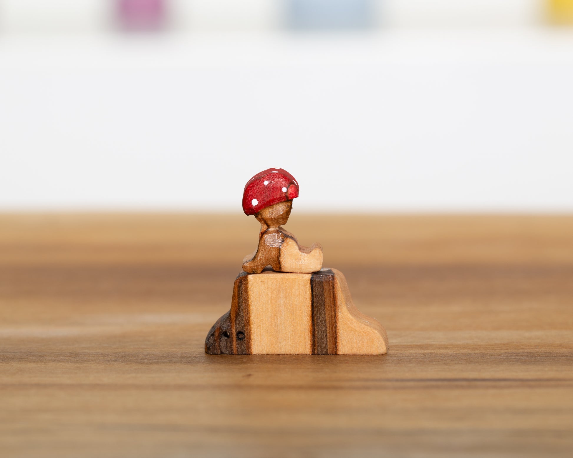 Little mushroom sprite made from maple with tree stump. Painted with watercolors, acrylic details and finished with linseed oil and beeswax blend.