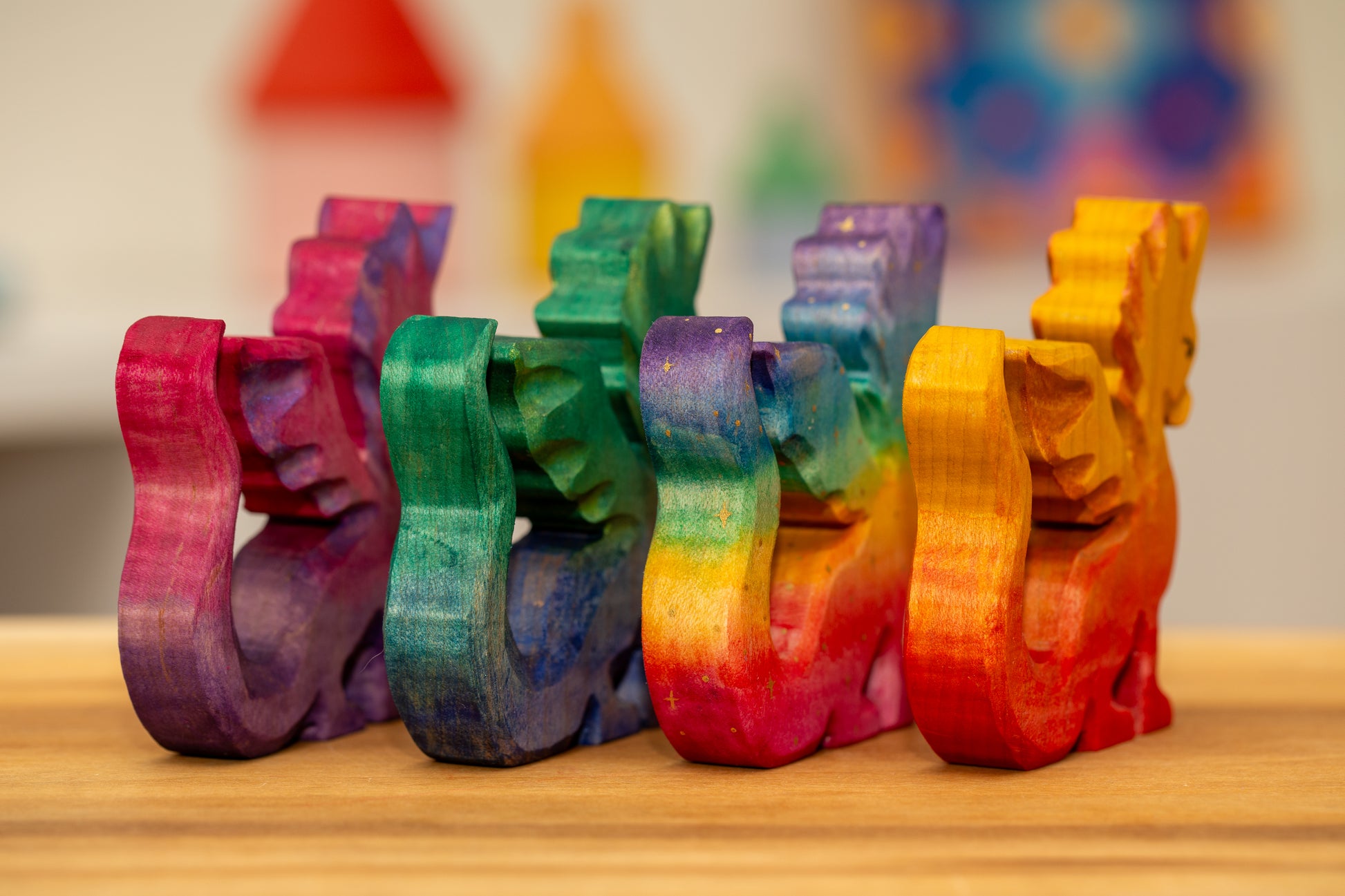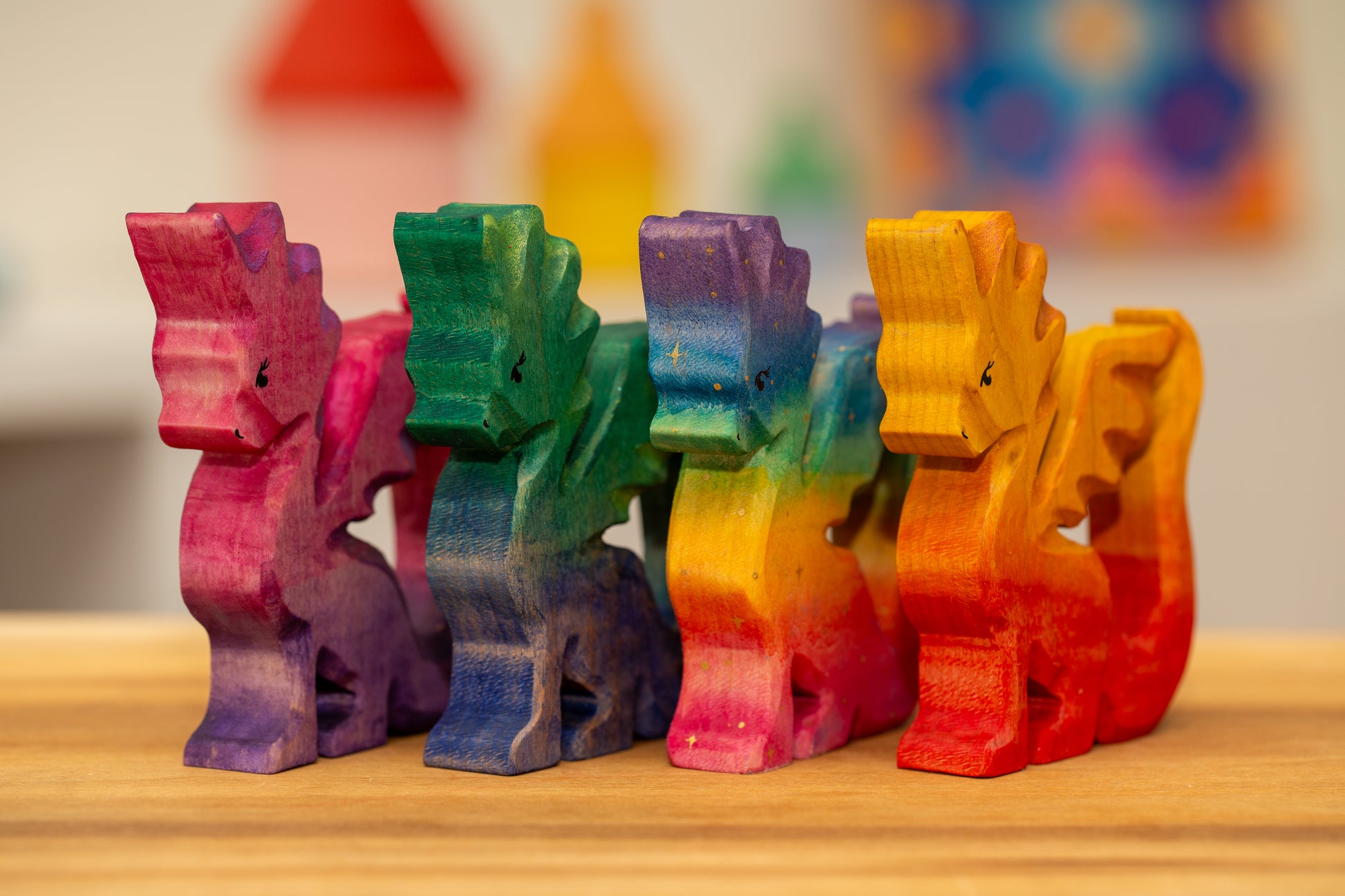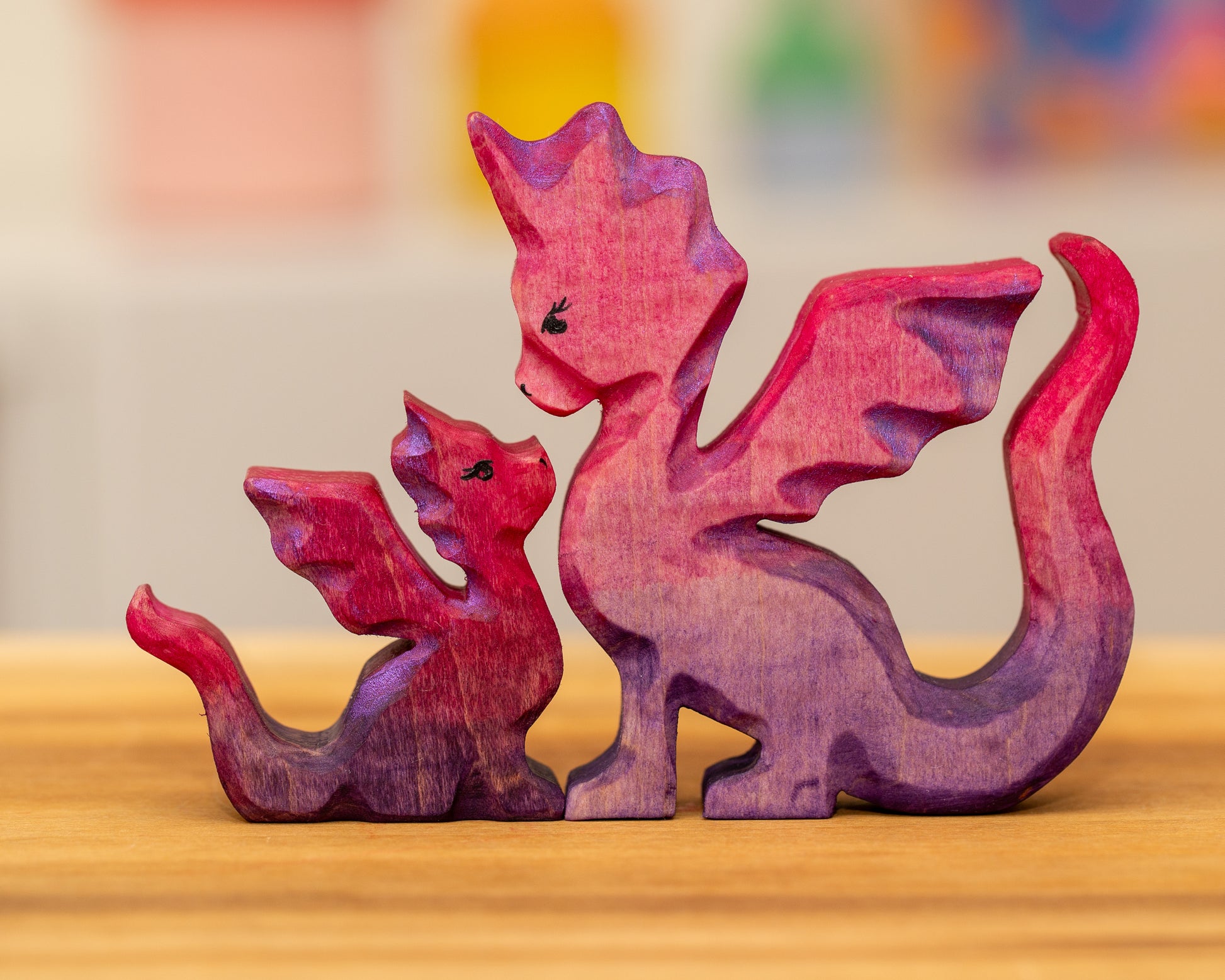 Two dragons made from curly maple. Painted with watercolors and acrylics finished with a linseed oil beeswax blend.