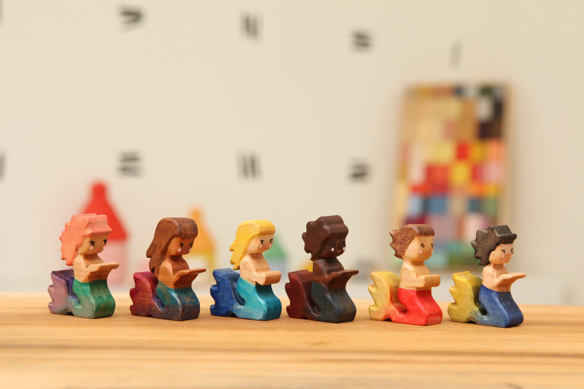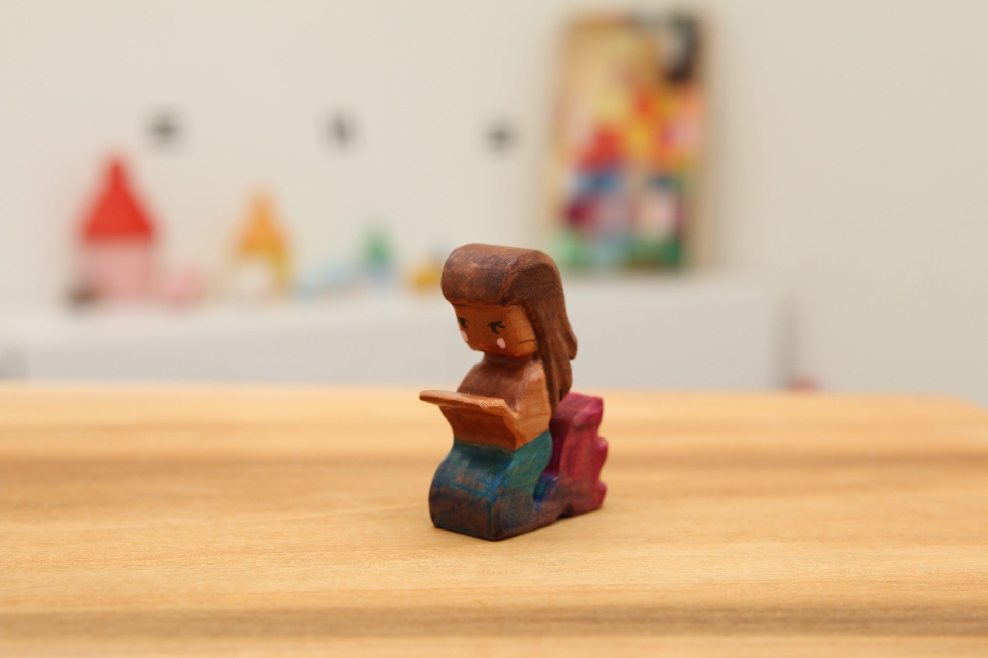 Cherry mermaid with brown hair and blue/pink tail. Painted with watercolors and acrylic details.