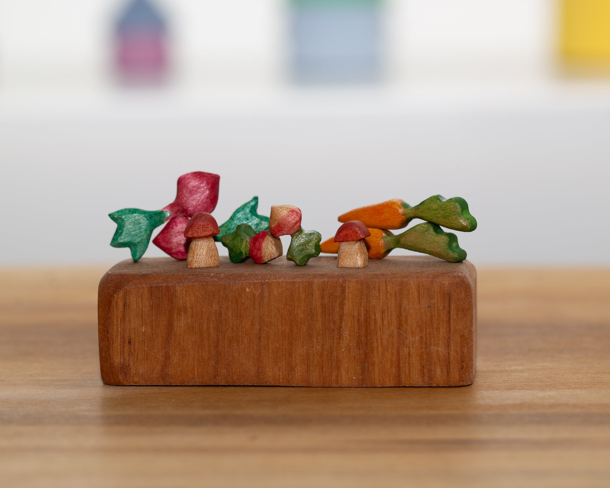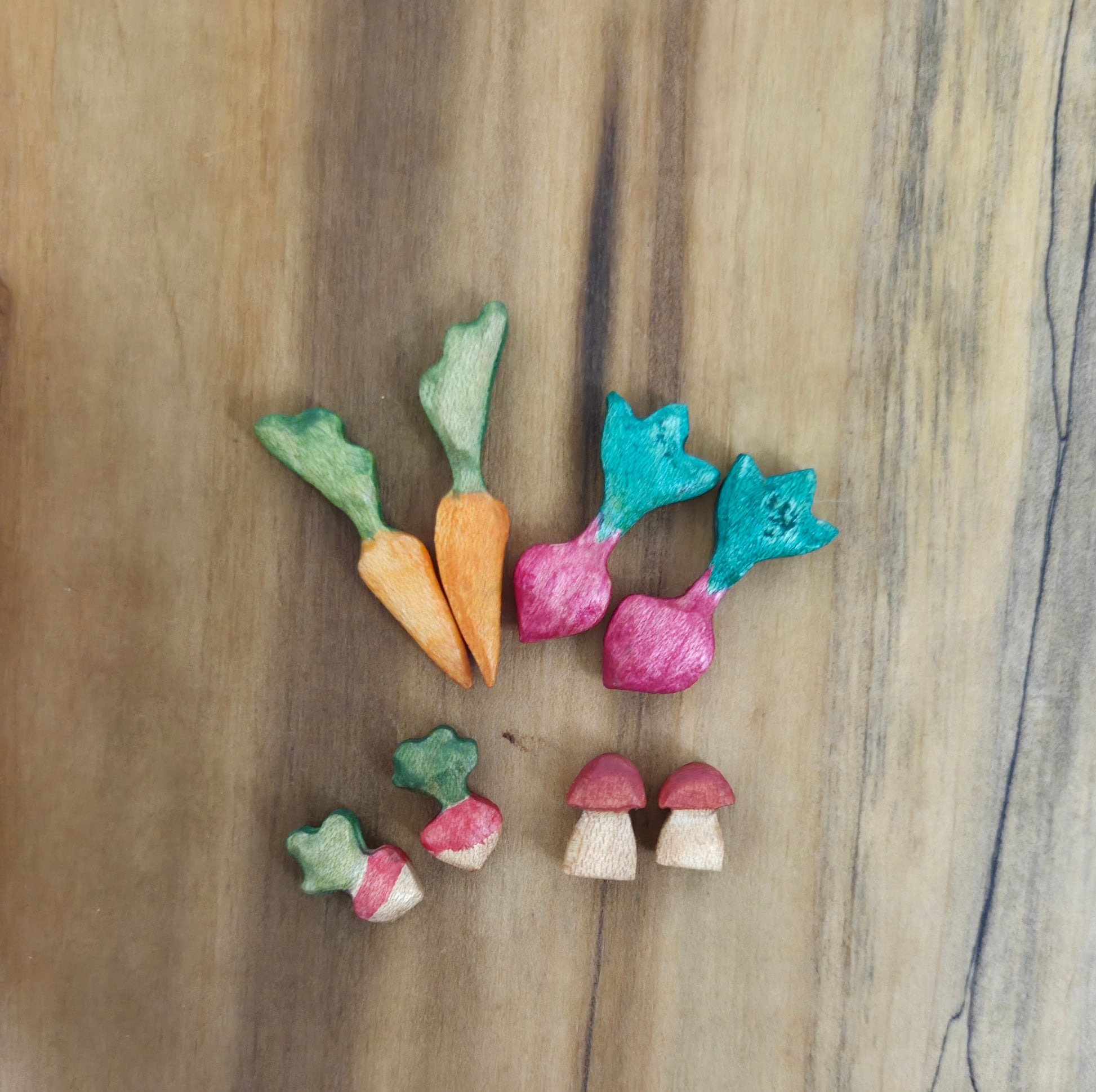 Tiny veggies. Set of 8. Made from maple, painted with watercolors and finished with linseed oil and beeswax blend. These are not for children under 3yrs of age.